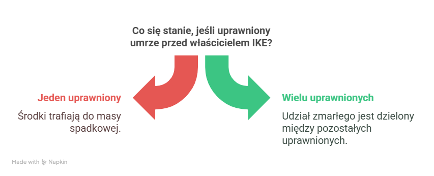 Co się wówczas dzieje? Otóż w takiej sytuacji, wskazanie takiej osoby staje się bezskuteczne, czyli tak jakby nigdy nie miało miejsca. Jeżeli więc określiłeś tylko jednego uprawnionego, to wtedy środki zgromadzone na IKE po prostu trafią do masy spadkowej.