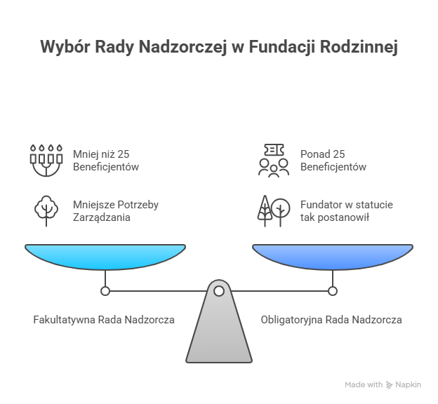 Ale jeżeli fundacja rodzinna obejmuje większą grupę beneficjentów (ponad 25 osób), wtedy Rada Nadzorcza staje się obligatoryjna. To logiczne – bo im większa rodzina i majątek, tym bardziej potrzeba organu, który zadba o porządek i równowagę interesów.
